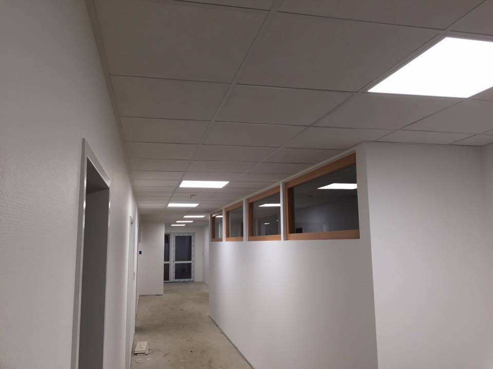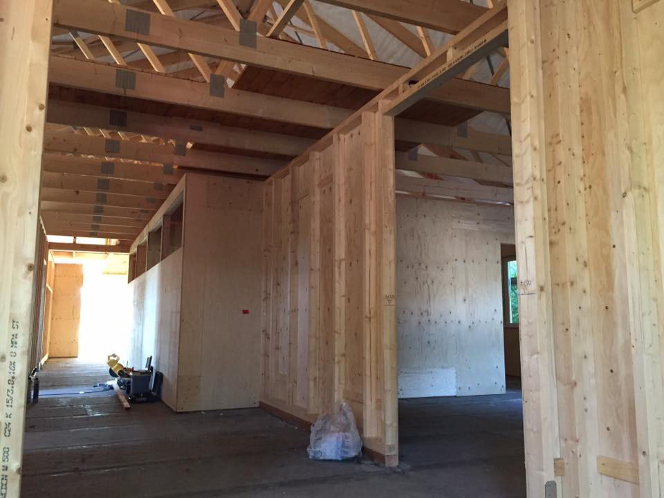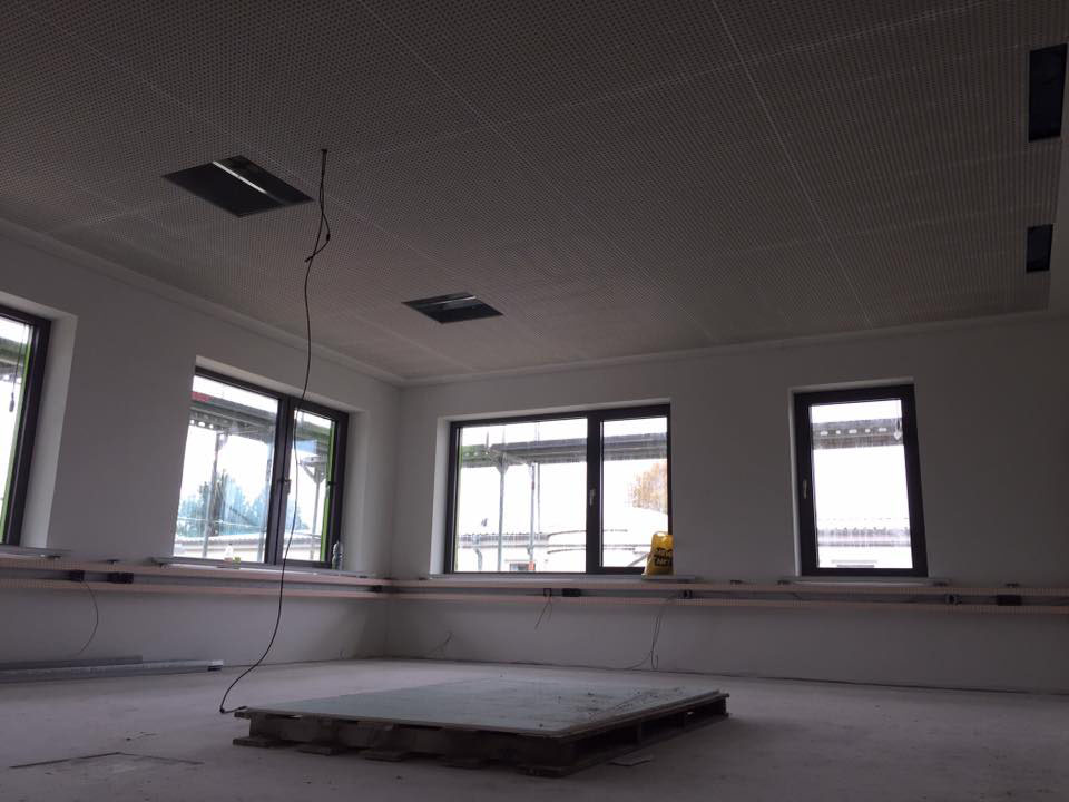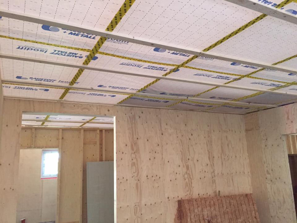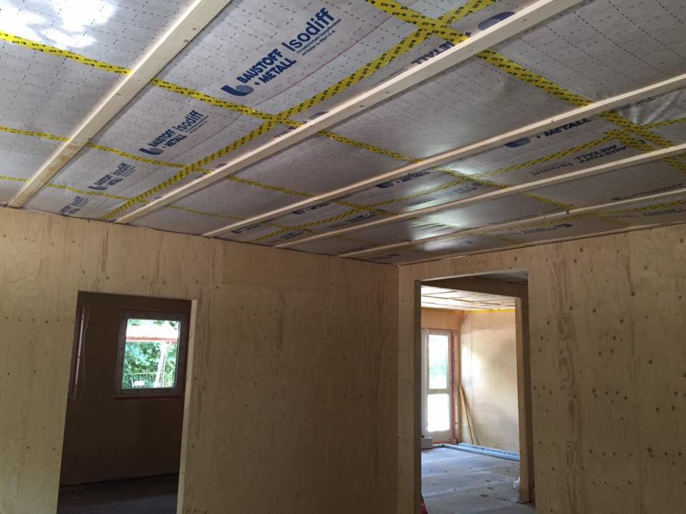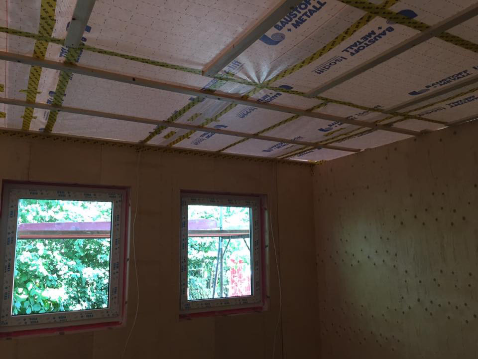 Neubau einer Kita aus Holztafelwänden, Decke isoliert und mit einer Dampfbremse winddicht abgeklebt,Einbau einer Akustikdecke