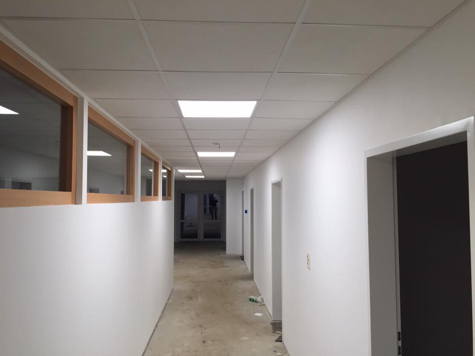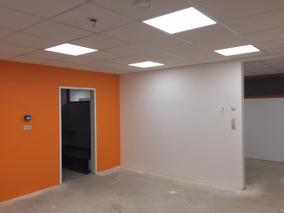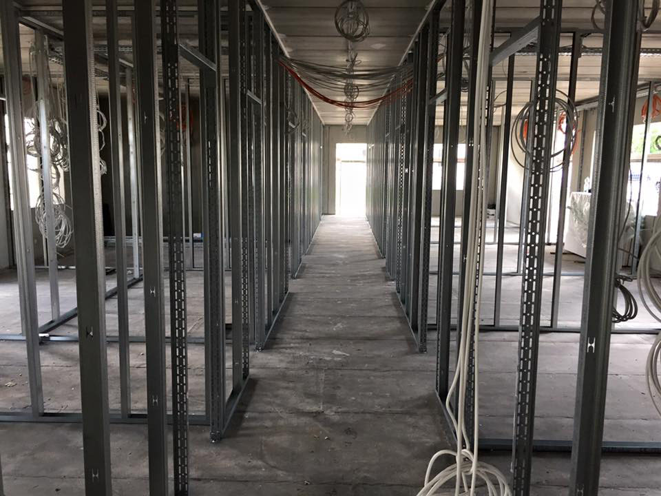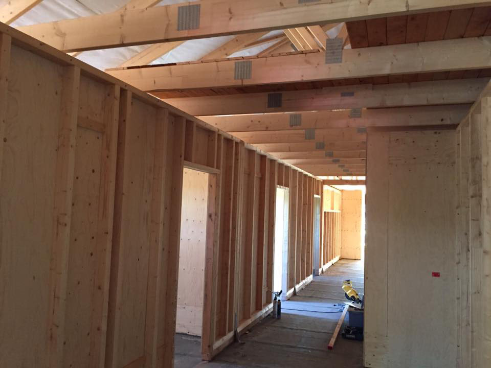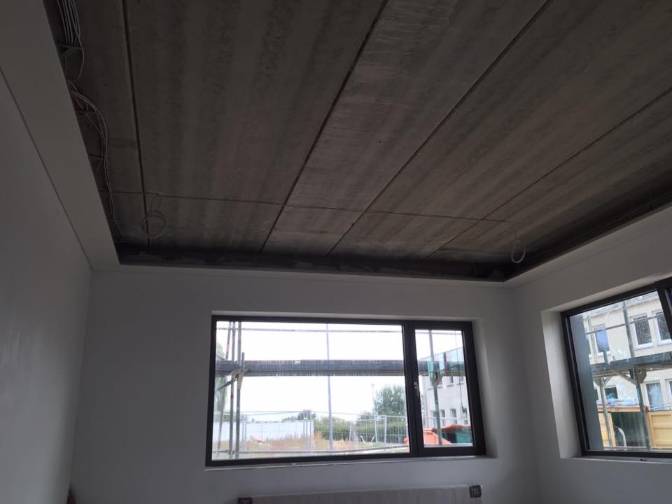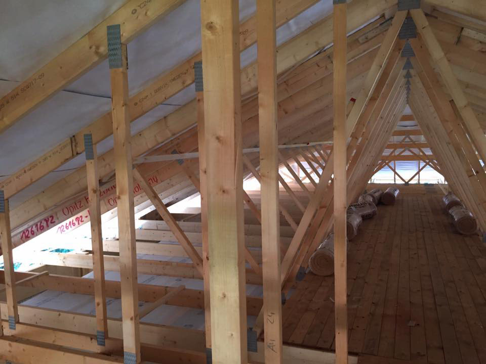 Neubau einer Kita aus Holztafelwänden, Decke isoliert und mit einer Dampfbremse winddicht abgeklebt,Einbau einer Akustikdecke